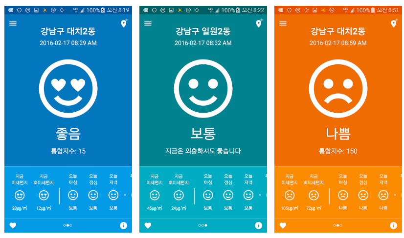 해당 앱은 지역마다 먼지 농도가 다양하게 표시됩니다. 좋음, 나쁨 등으로 단계별로 구분되어 있는 것도 좋습니다. 다만 약간의 오류가 발생하는 경우도 있습니다. 예를들어 수치 자체가 정확하지 않을 수도 있습니다. 특히 측정소가 먼 경우에는 미세먼지가 심각한데도 좋음으로 표시되는 경우도 있어요.